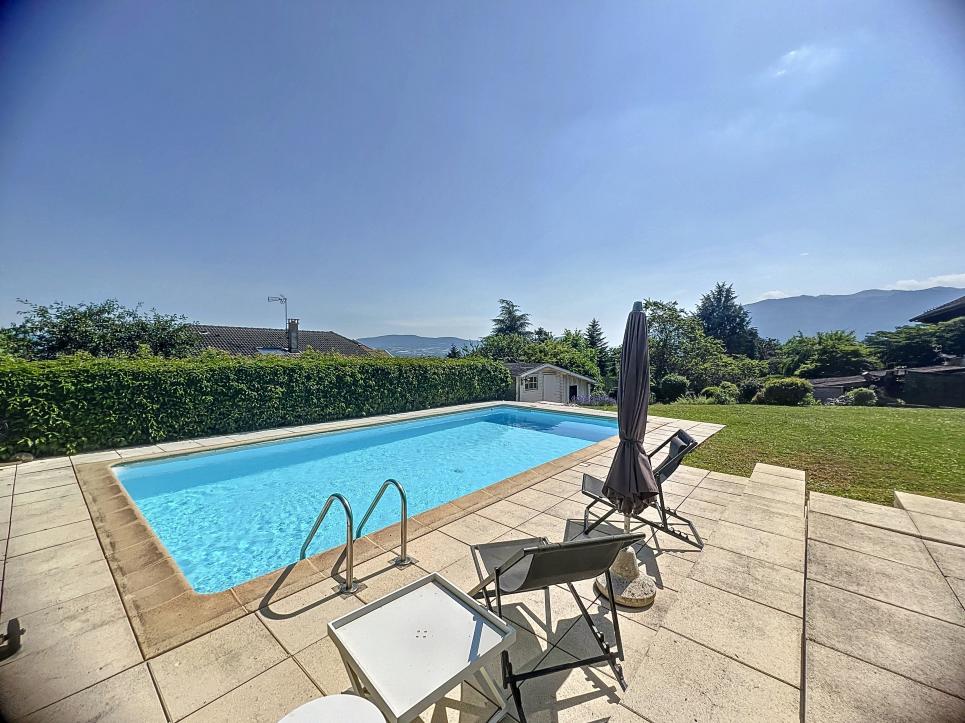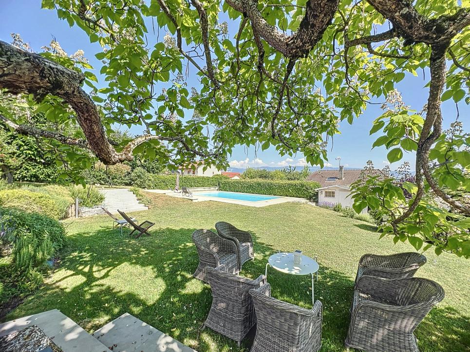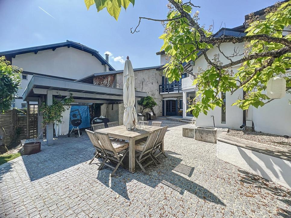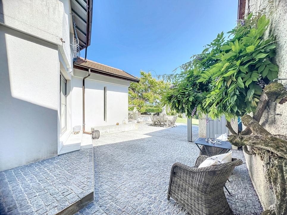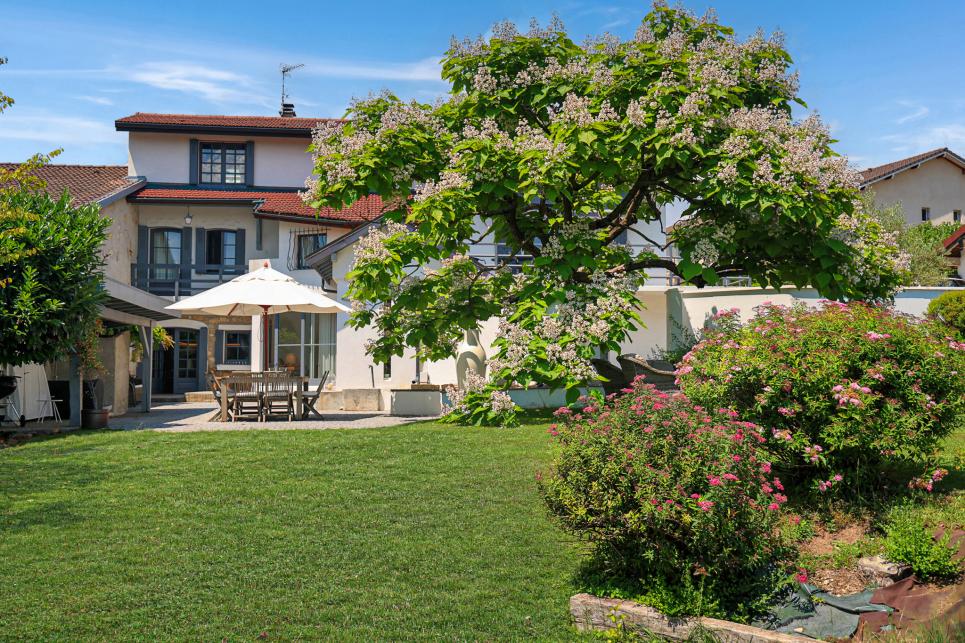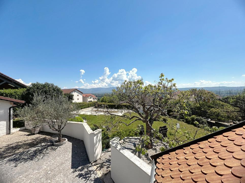 Jardin arboré, portail motorisé, alarme, caméras, carport, stationnements. Un bien rare, alliant charme, confort et proximité genevoise.