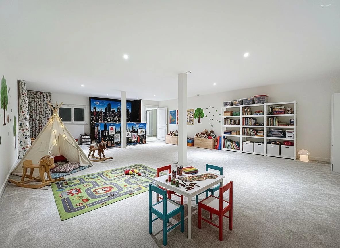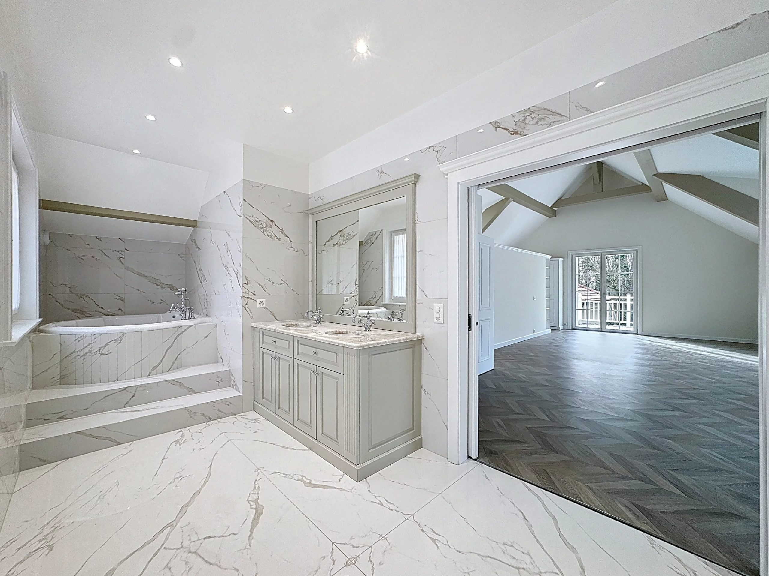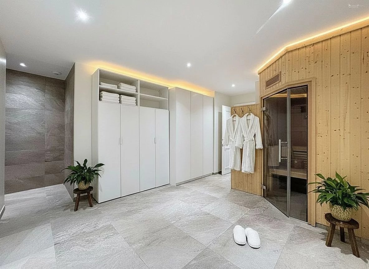 Elle propose de spacieux espaces de vie, 5 chambres avec salles de bains en suite, un espace bien-être avec sauna, une salle de fitness, une cave à vin, et de nombreuses autres pièces polyvalentes.