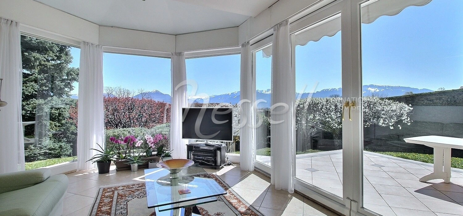 Vue panoramique sur les Alpes, Luminosité exceptionnelle et calme absolu vous sont assurées à 12 kilomètres du centre de Genève (Vieille Ville), dans cette splendide Propriété proche du Golf Club d’Esery, de plus de 300 m2 de surface utile.